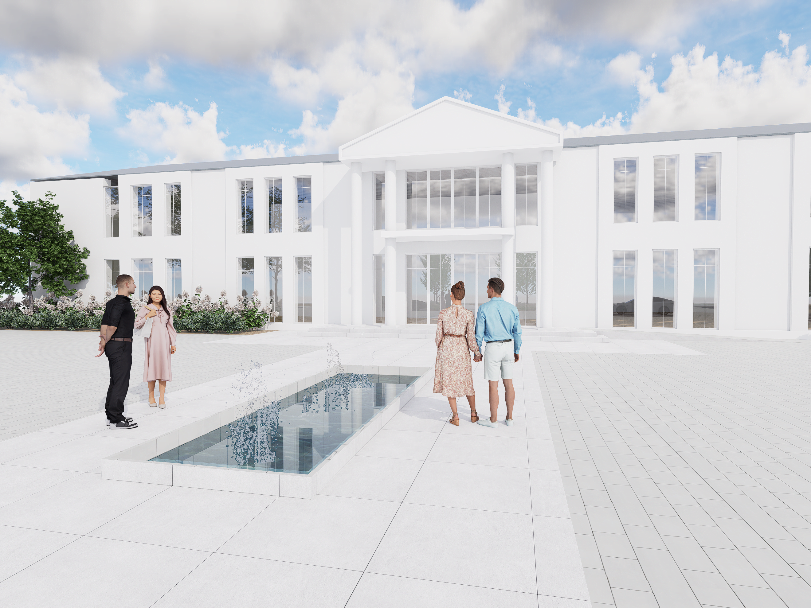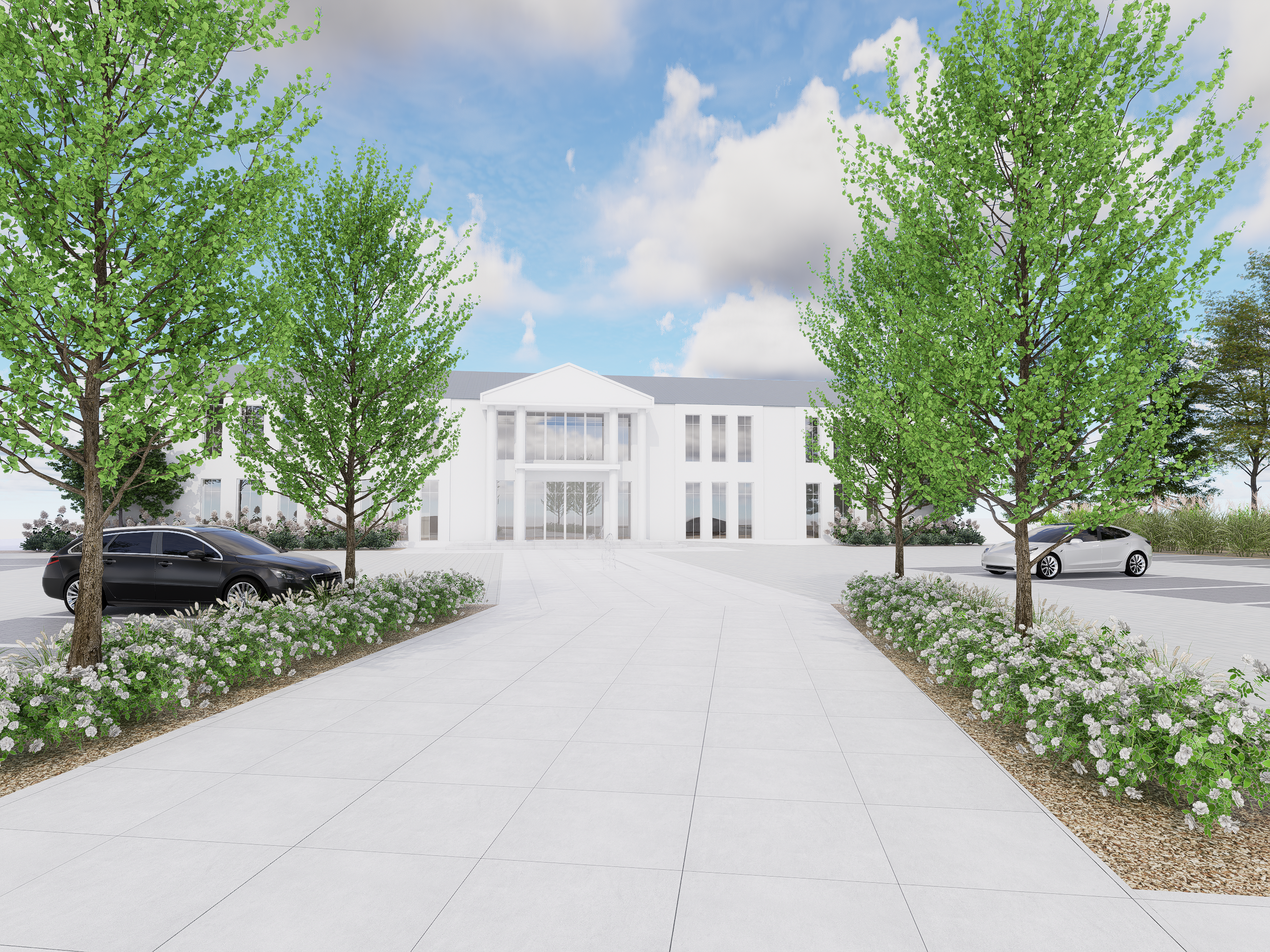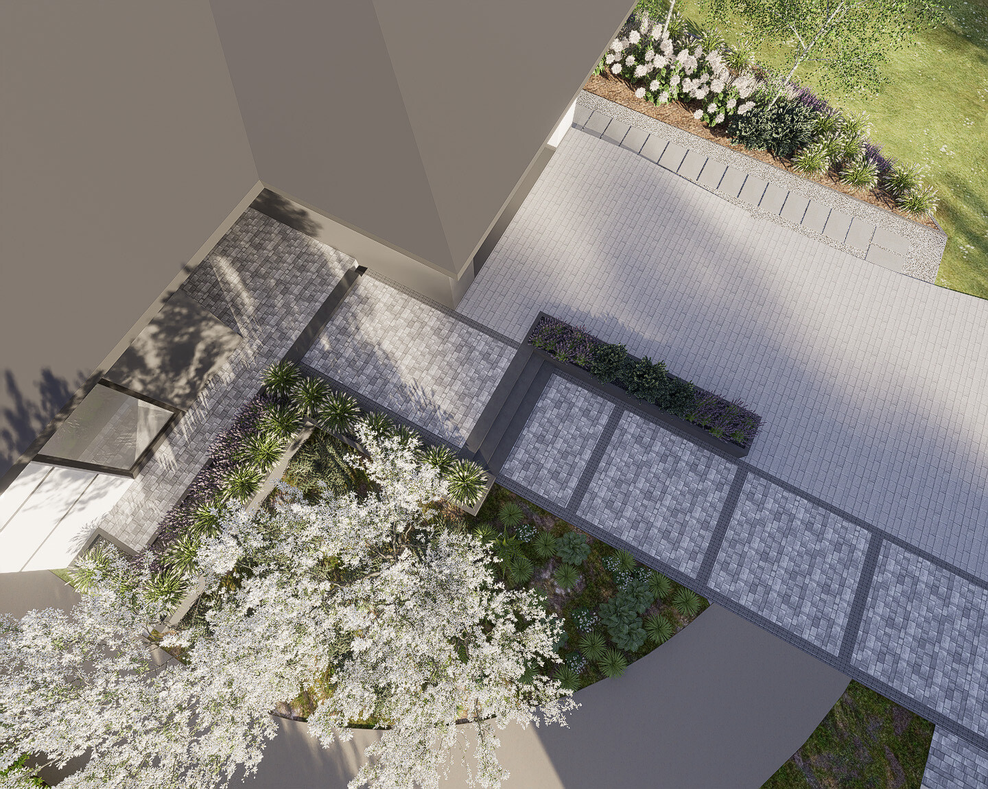 W części frontowej znalazł się parking dla gości oraz klasyczna fontanna, umieszczona centralnie na osi wejścia jako spokojny, ale wyrazisty akcent kompozycyjny.
