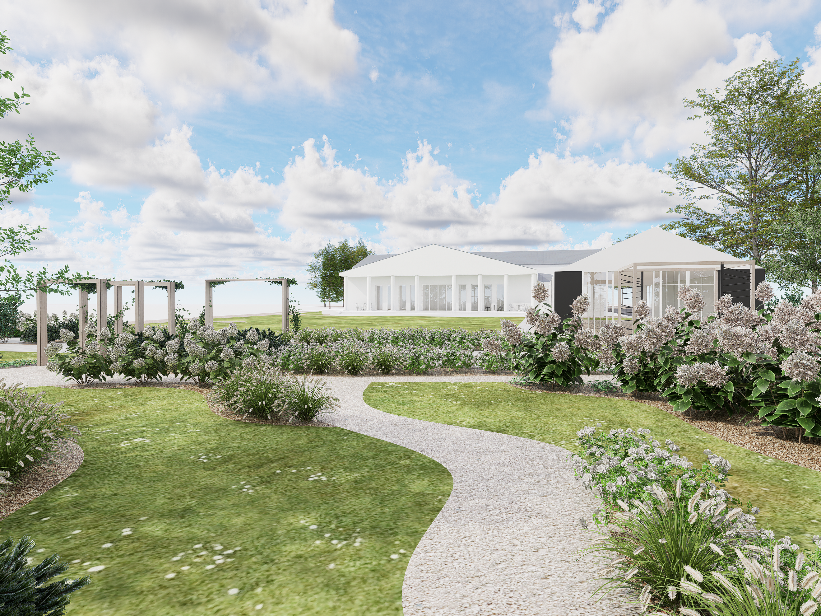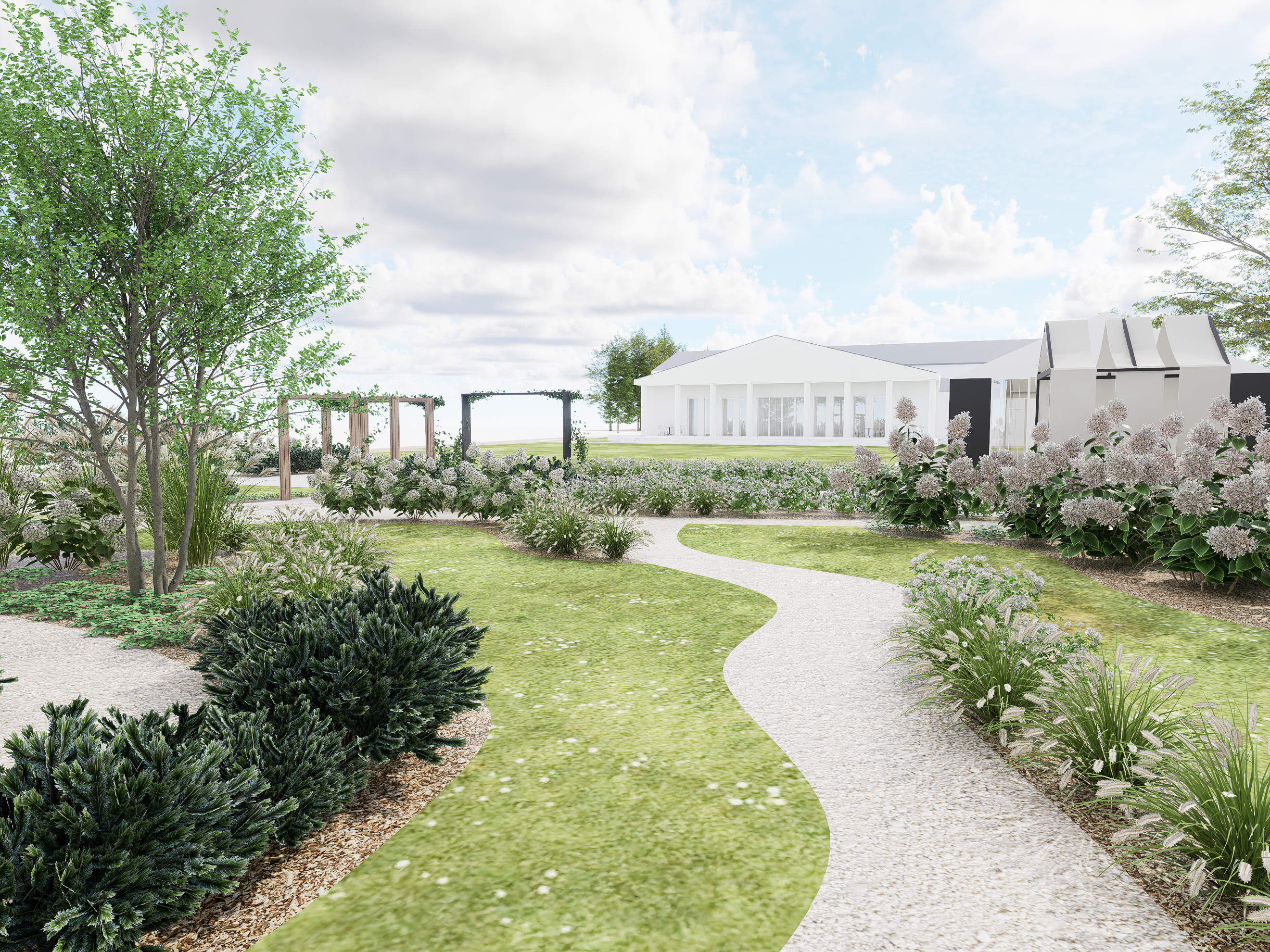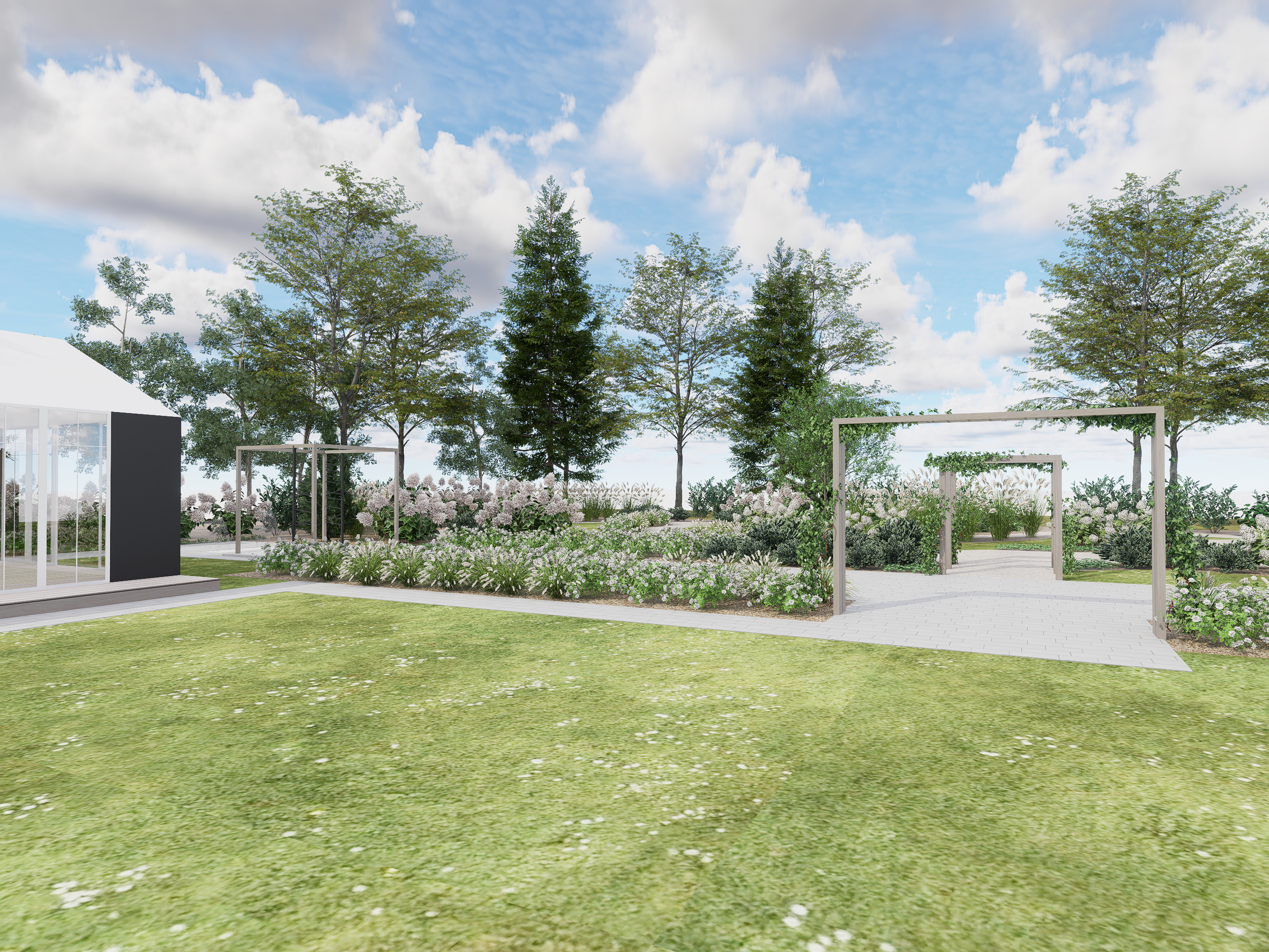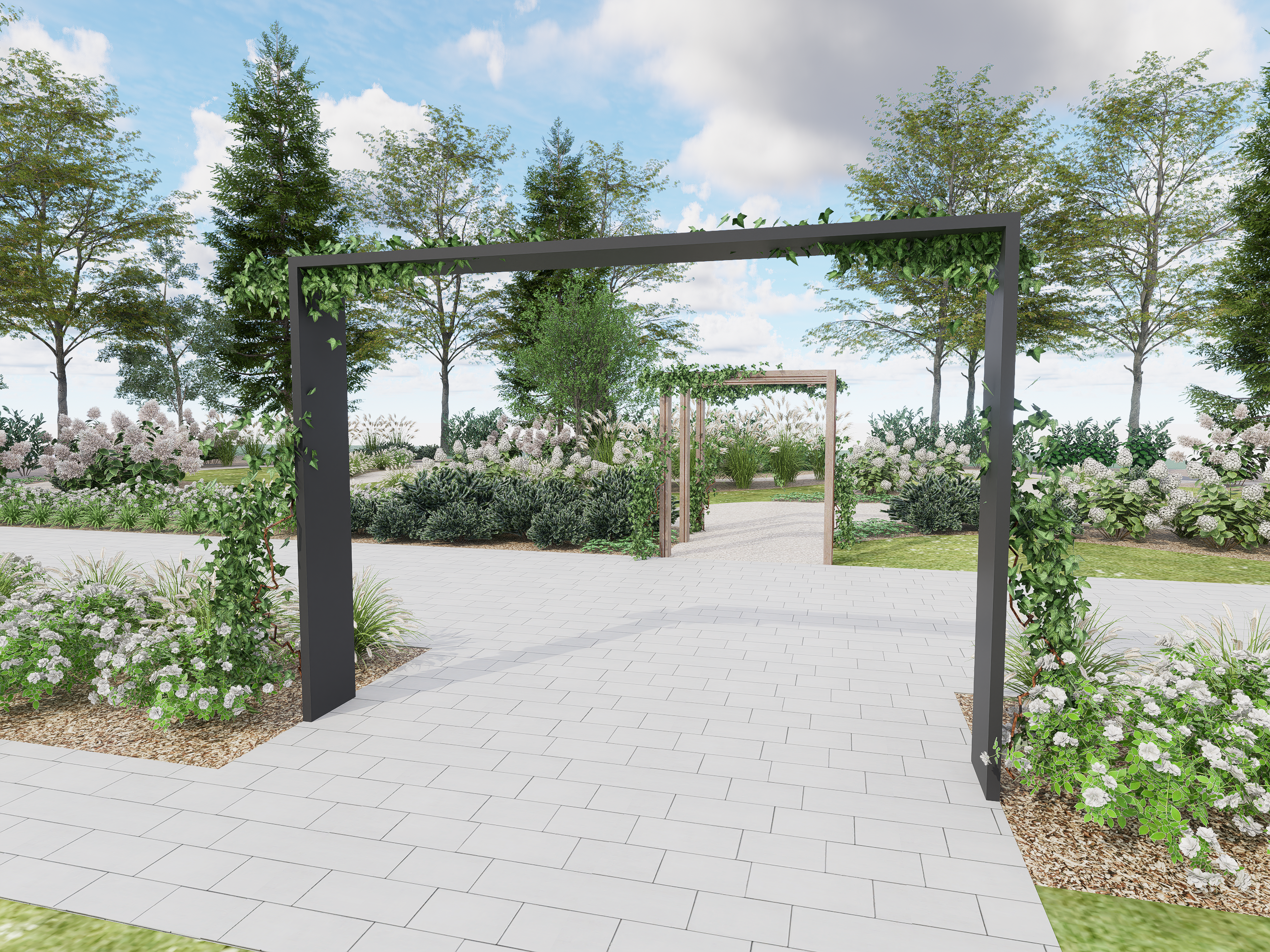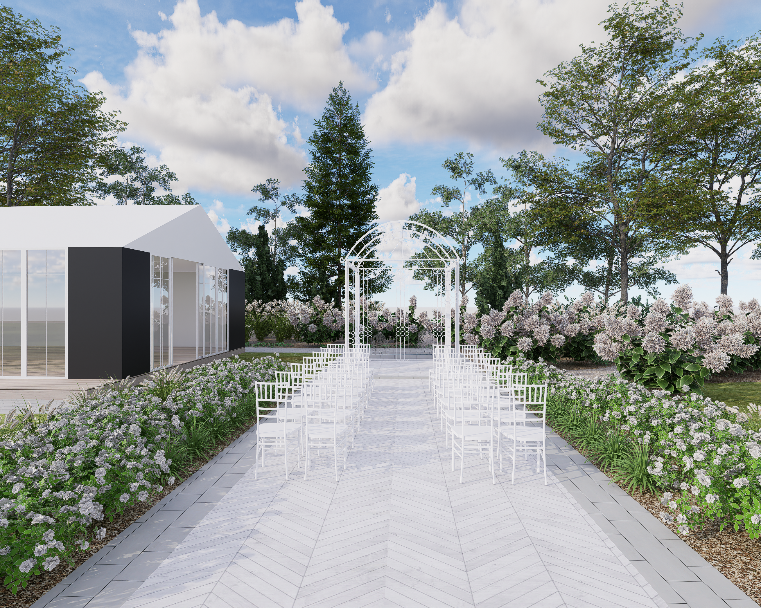 W dalszej części ogrodu zaplanowano niewielki park z alejkami spacerowymi oraz altanę do ceremonii ślubnych, wkomponowaną naturalnie w zieleń. Przestrzeń działa nie tylko podczas uroczystości – pozostaje funkcjonalna i estetyczna także na co dzień.