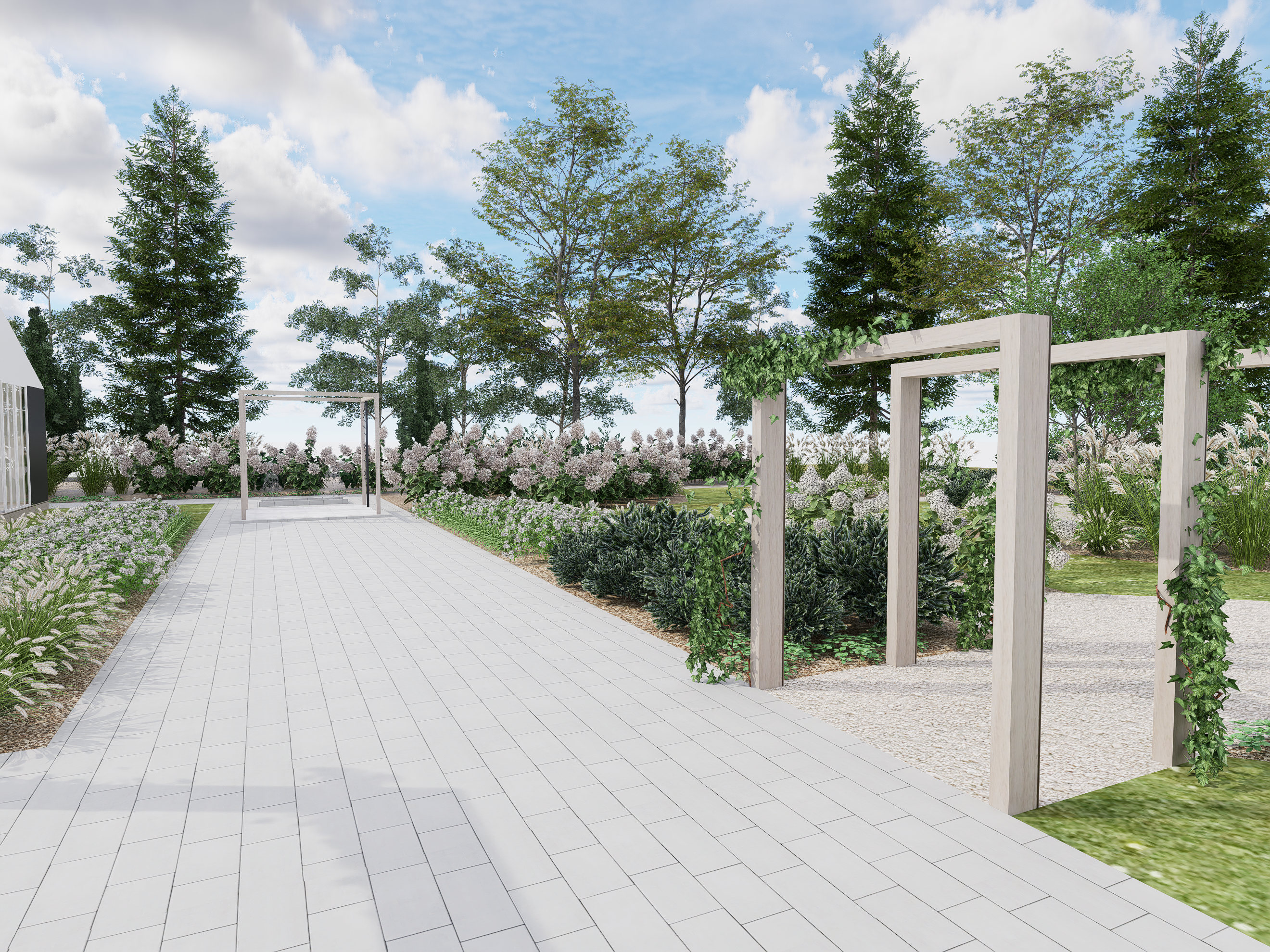 Na prośbę inwestorów całość została oparta wyłącznie na białokwitnących gatunkach, co nadaje ogrodowi stonowany i ponadczasowy charakter. W nasadzeniach dominują rośliny zimozielone, które budują strukturę niezależnie od pory roku.