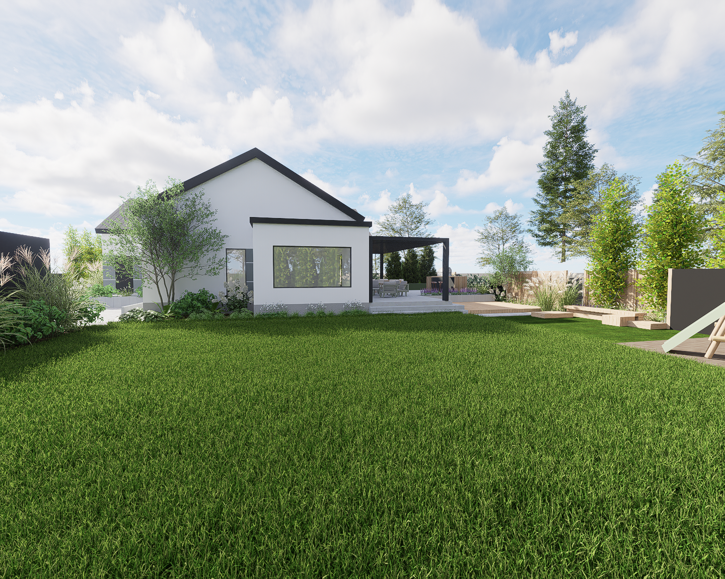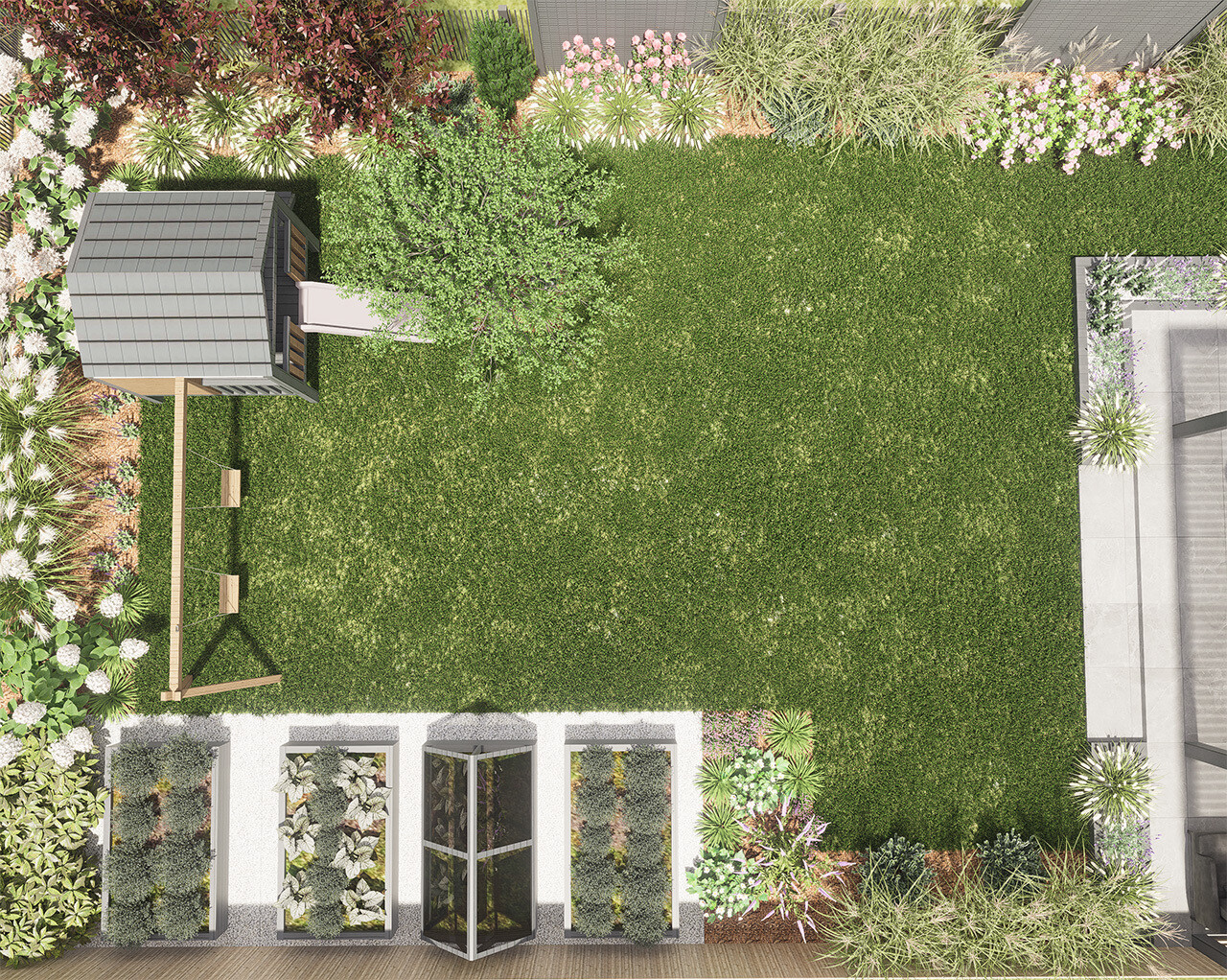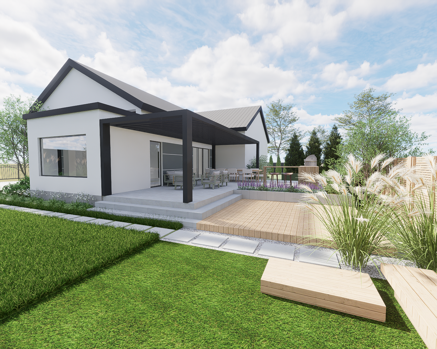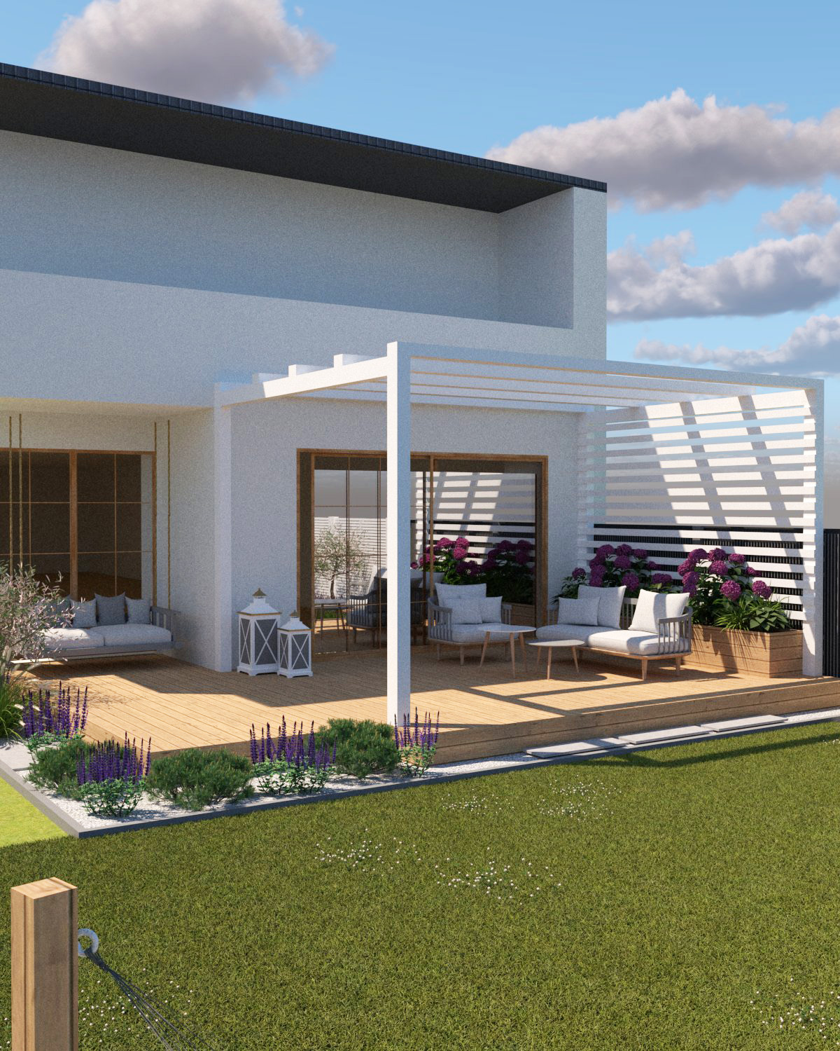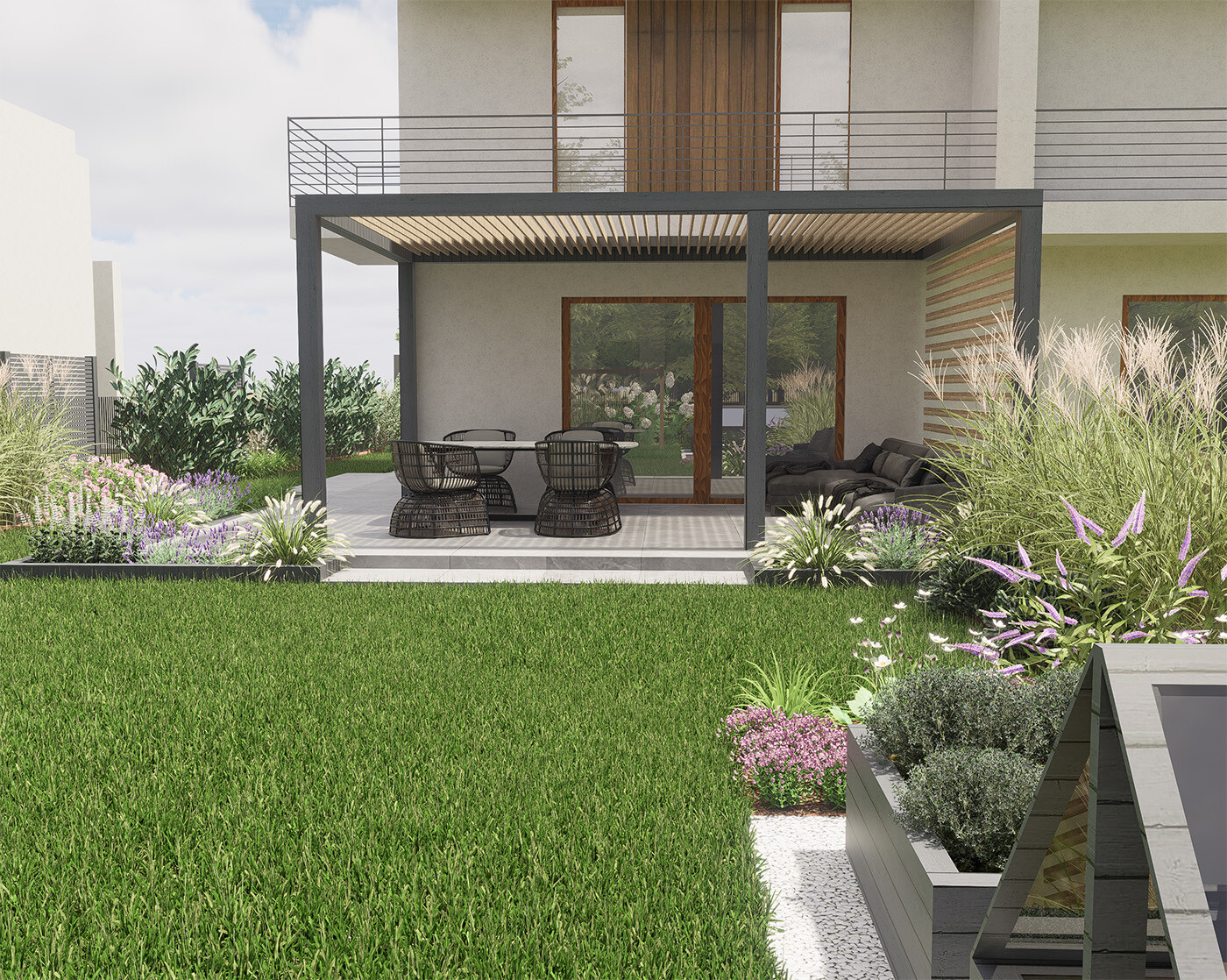 Głównym celem było stworzenie funkcjonalnej i spójnej przestrzeni, która zapewni prywatność, ale jednocześnie pozostawi otwartą część rekreacyjną z trawnikiem.