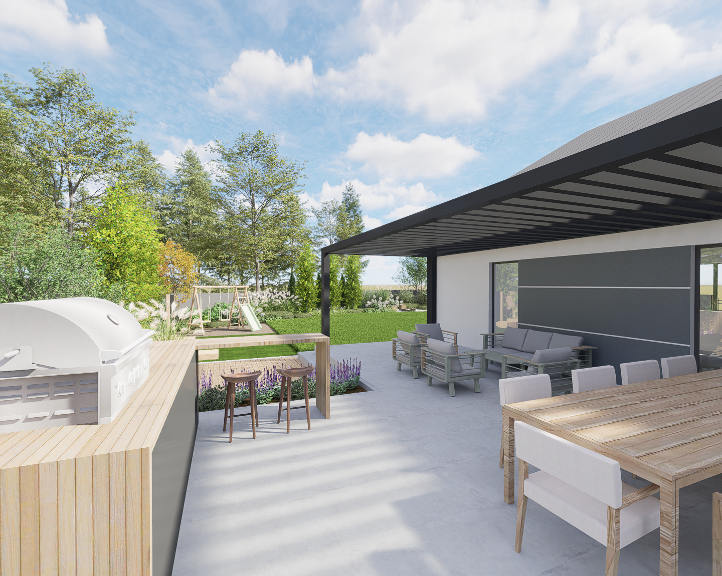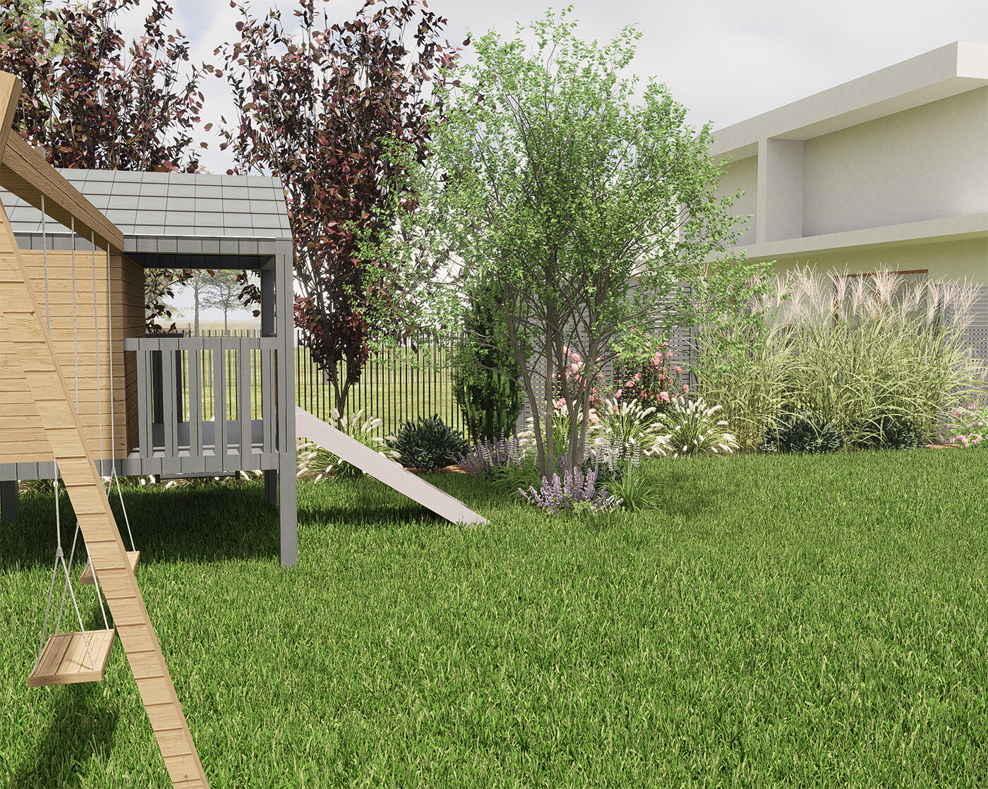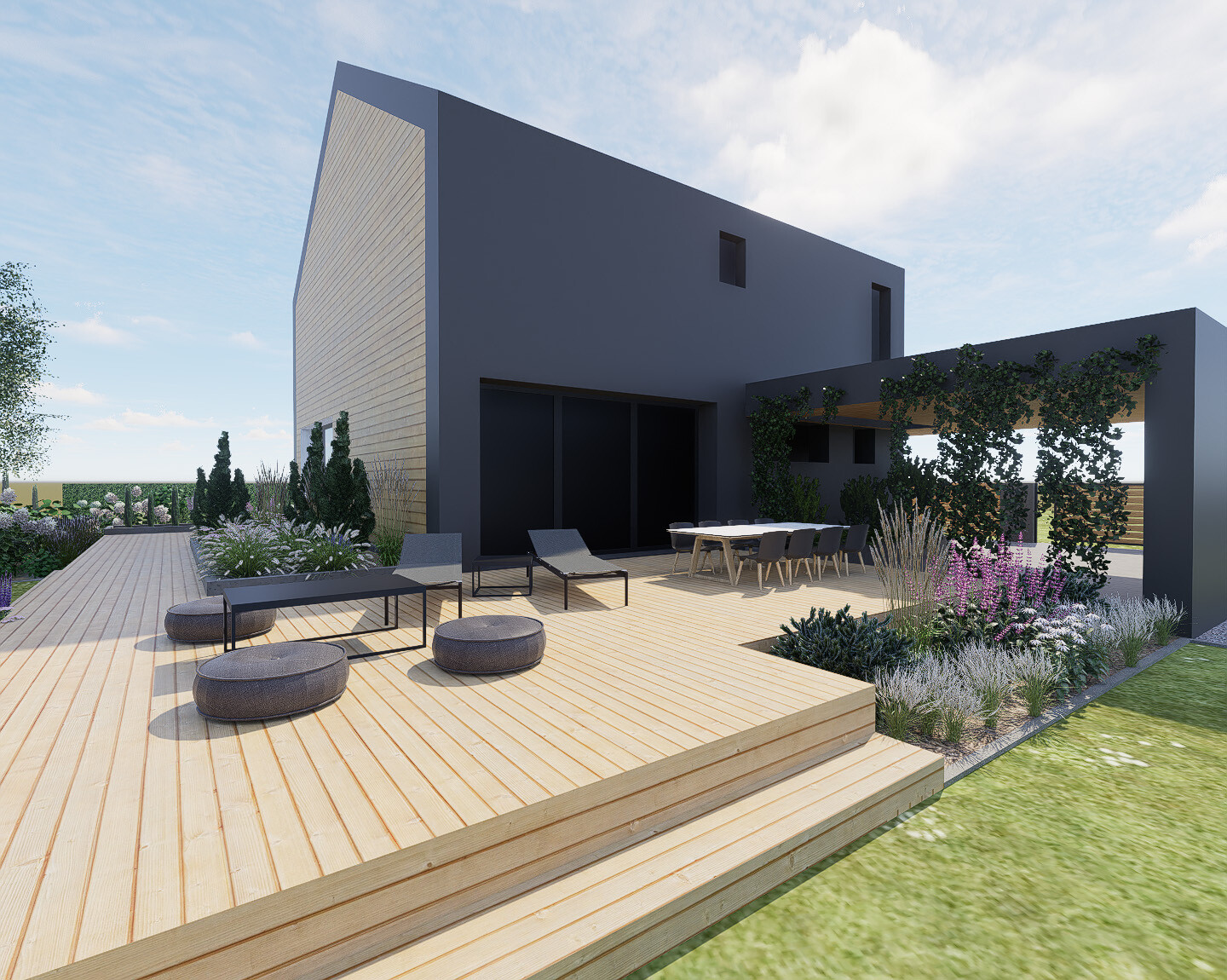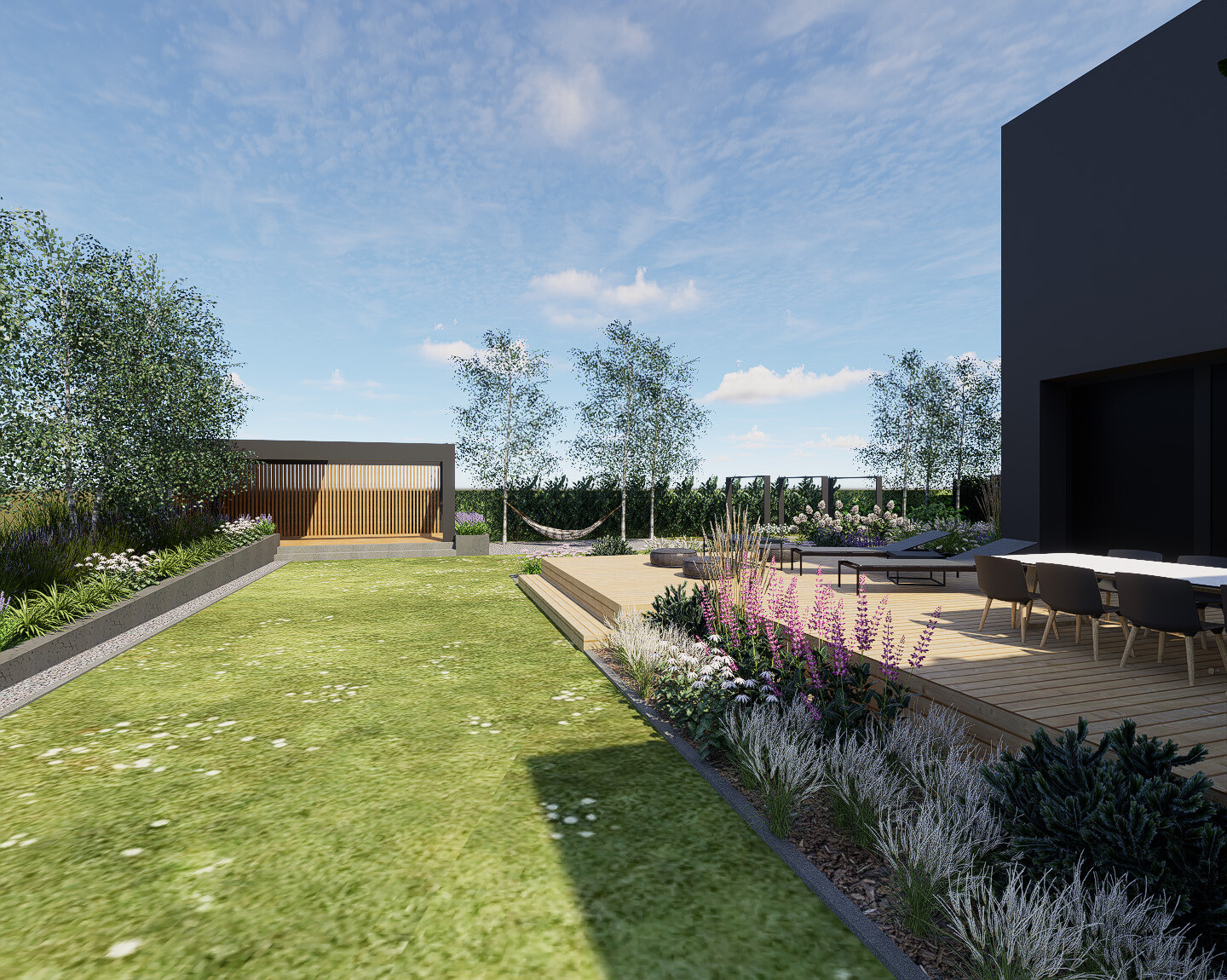 Głównym celem było stworzenie funkcjonalnej i spójnej przestrzeni, która zapewni prywatność, ale jednocześnie pozostawi otwartą część rekreacyjną z trawnikiem.