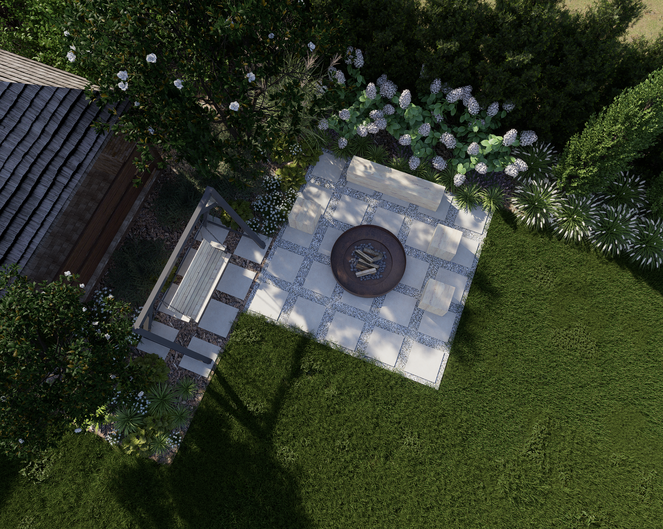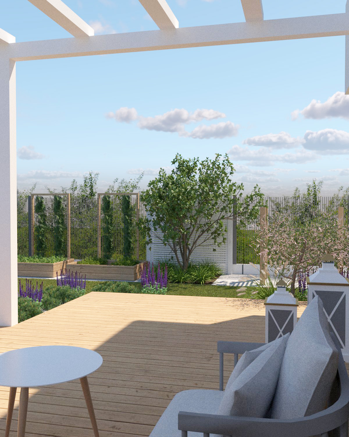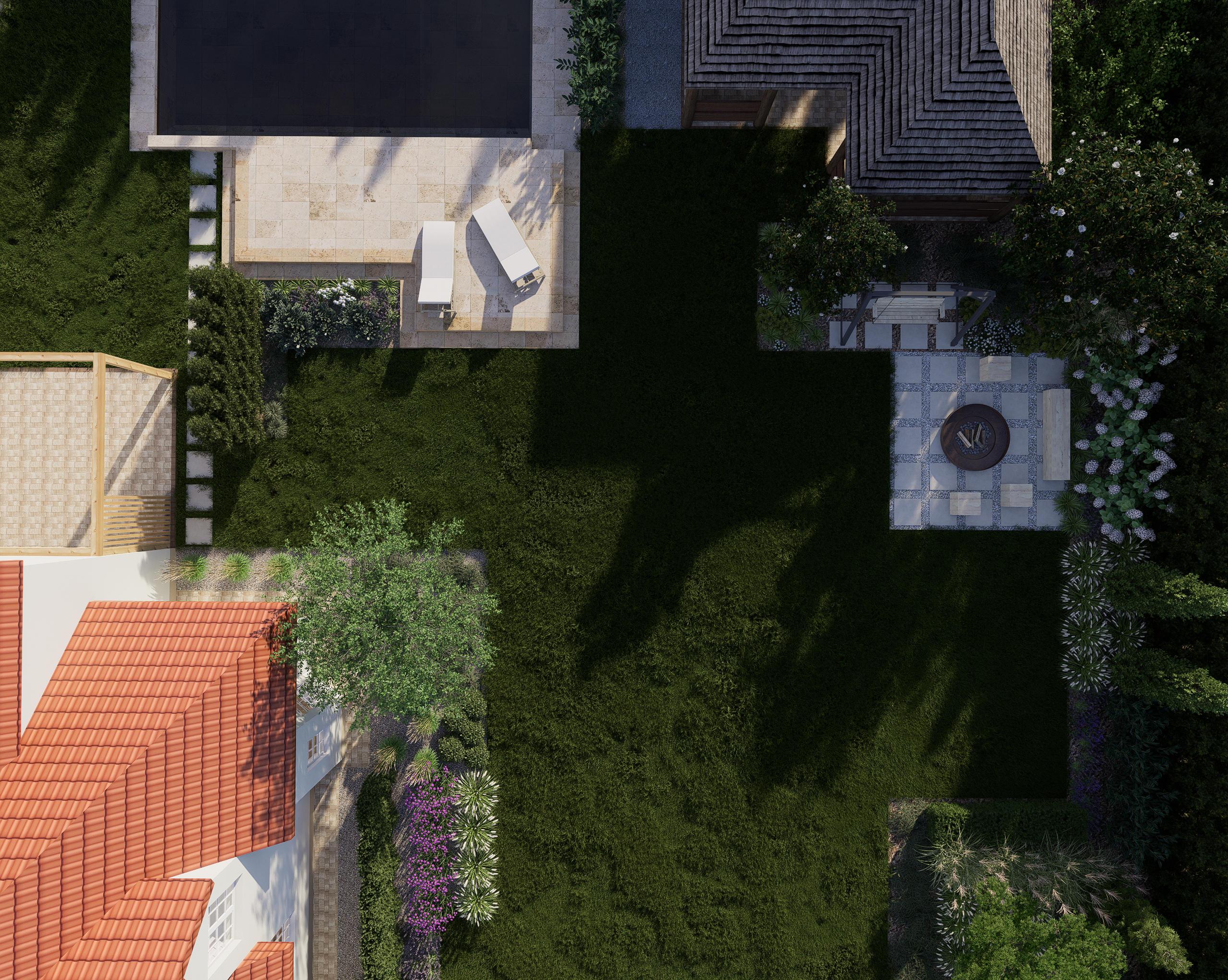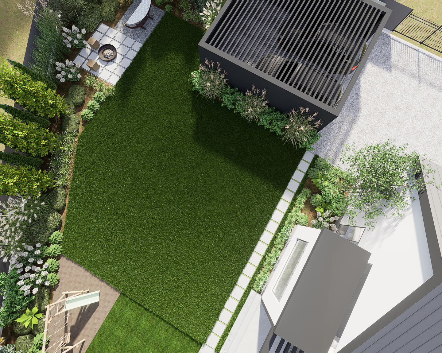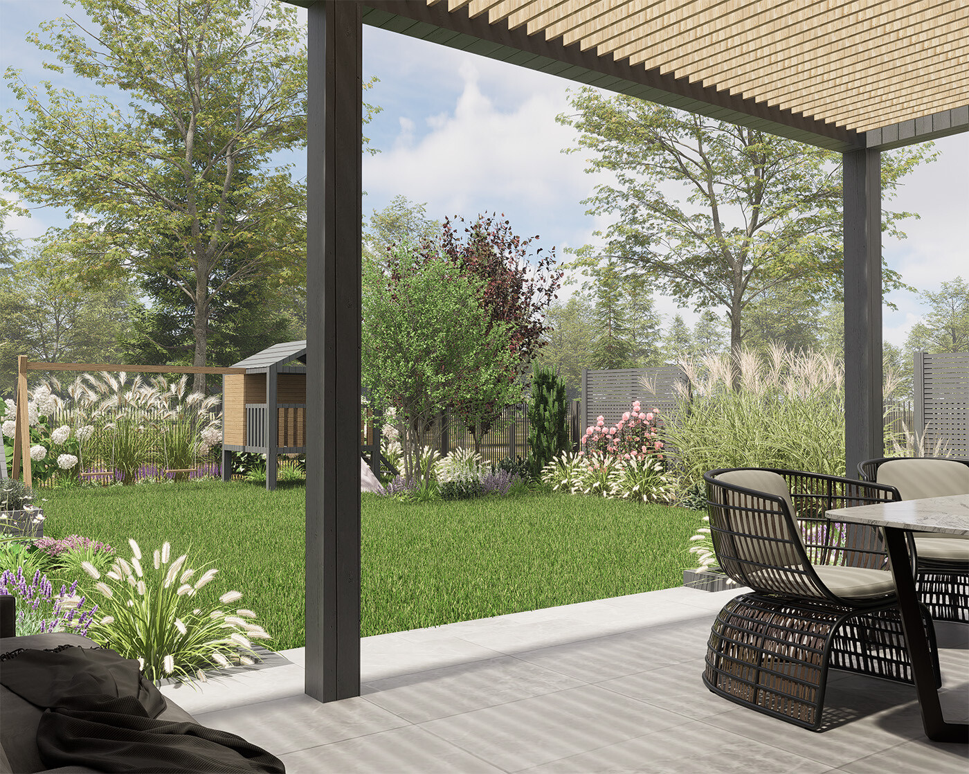 Głównym celem było stworzenie funkcjonalnej i spójnej przestrzeni, która zapewni prywatność, ale jednocześnie pozostawi otwartą część rekreacyjną z trawnikiem.