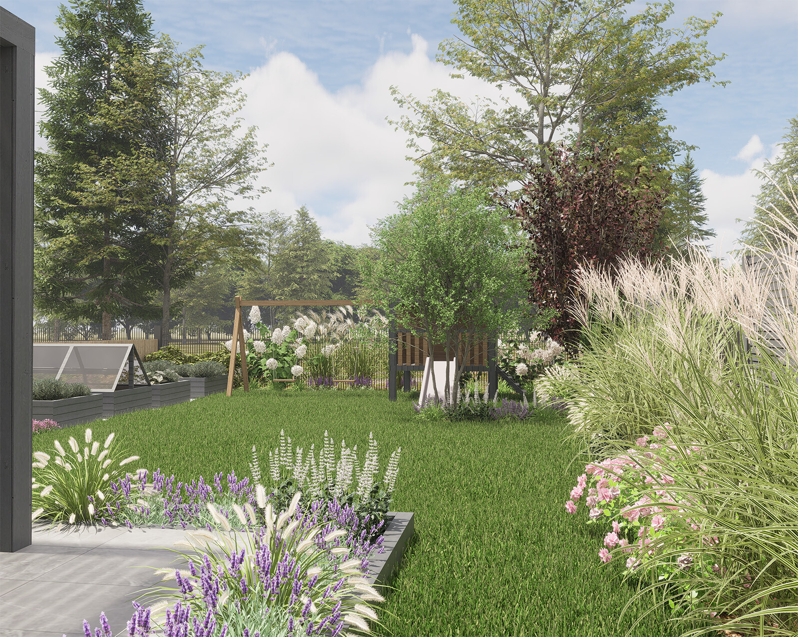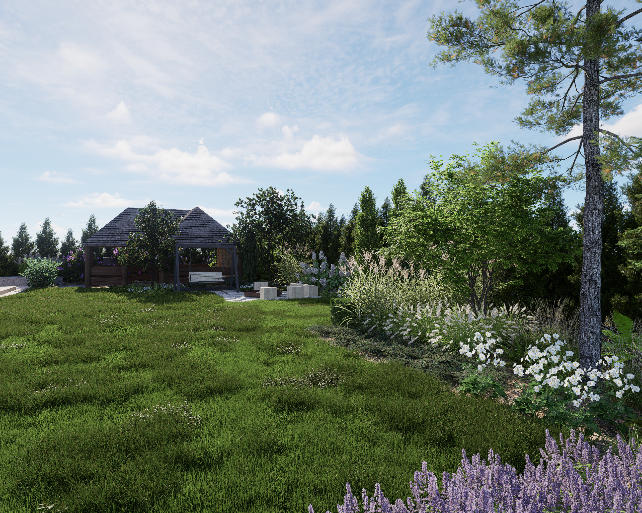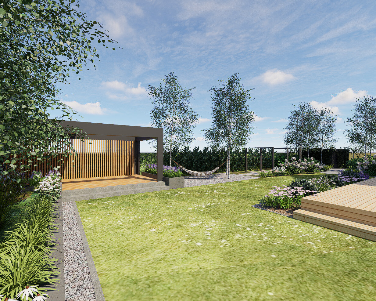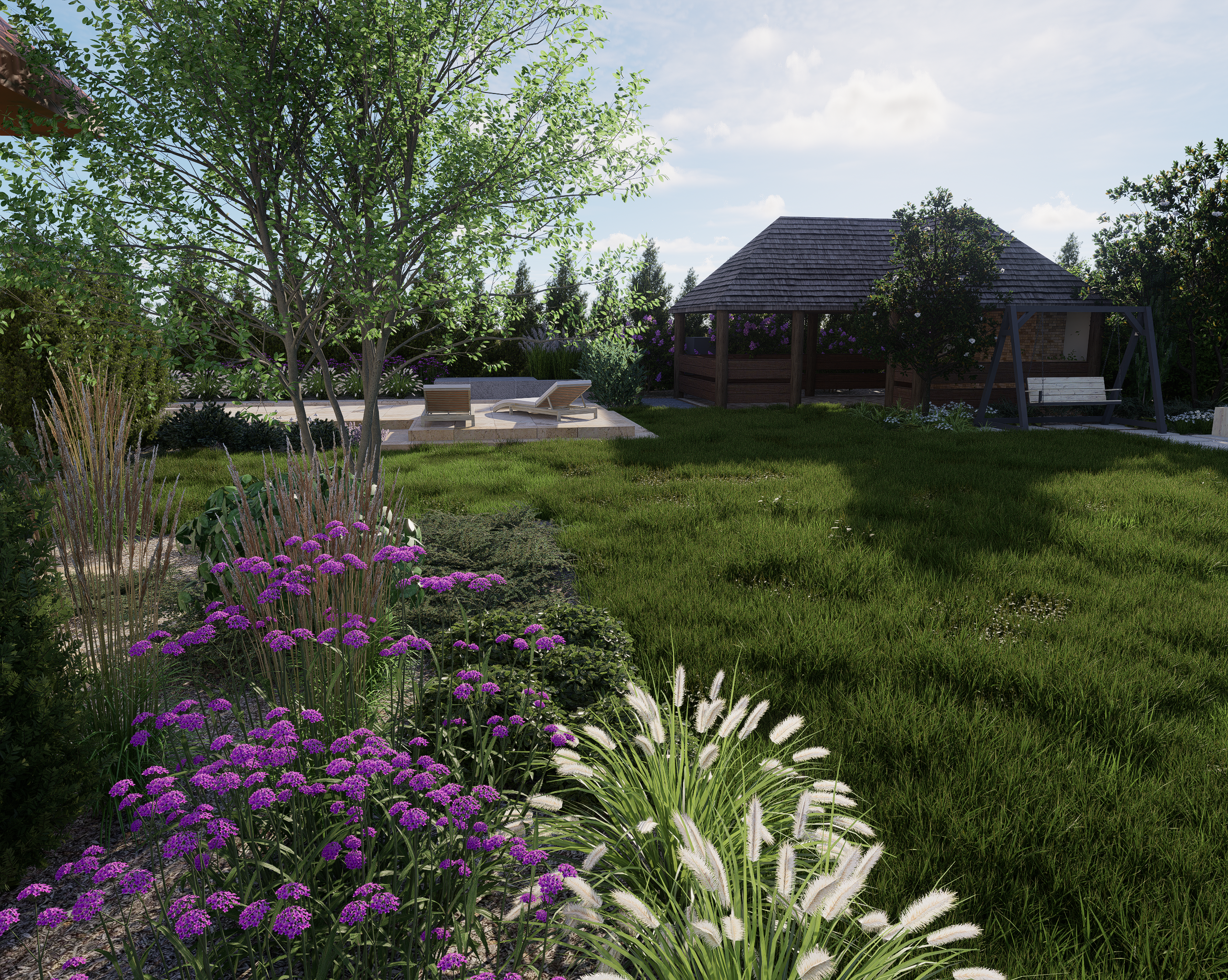 Część ogrodu była już zagospodarowana — istniał taras, podjazd i altana. Moim zadaniem było wkomponowanie tych elementów w całość i zaplanowanie zieleni tak, aby ogród zyskał strukturę, funkcję i przyjemny rytm.