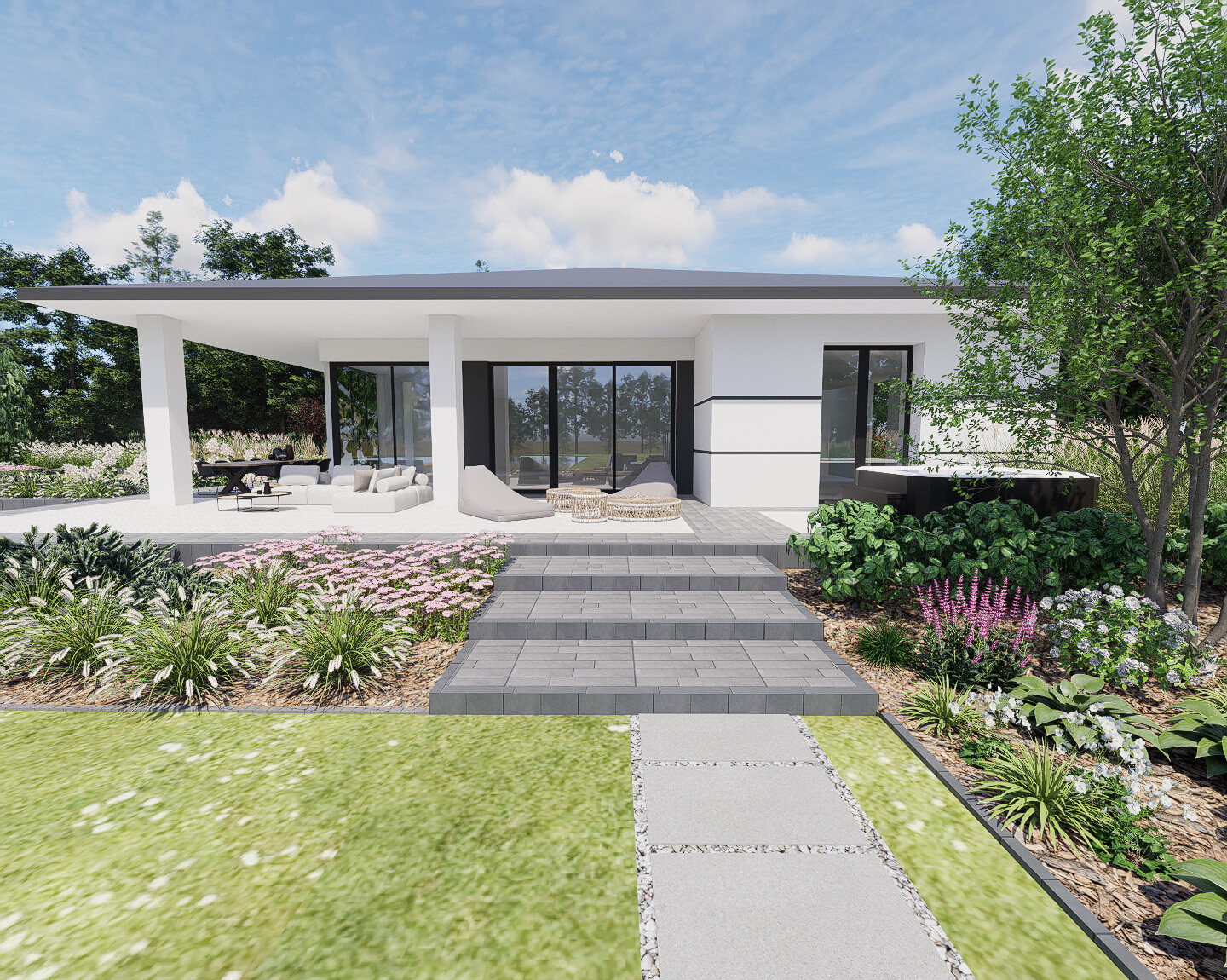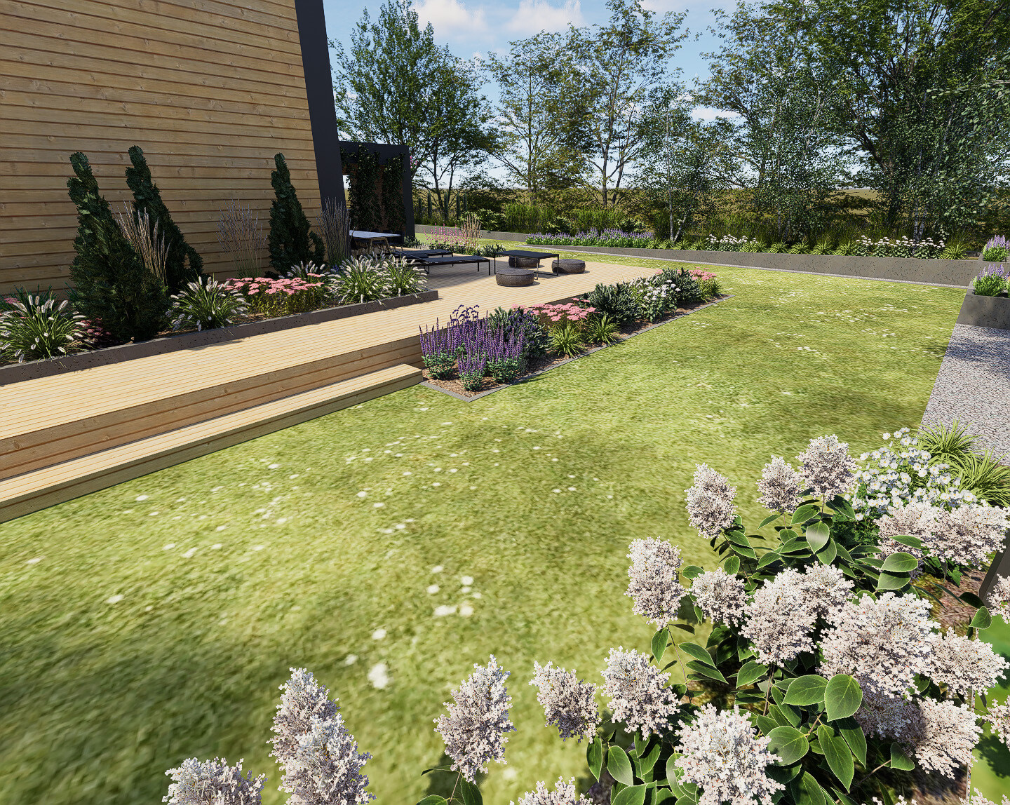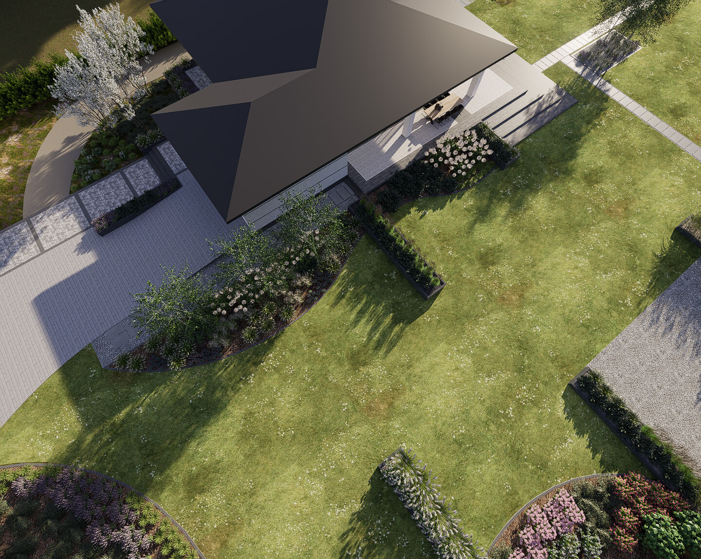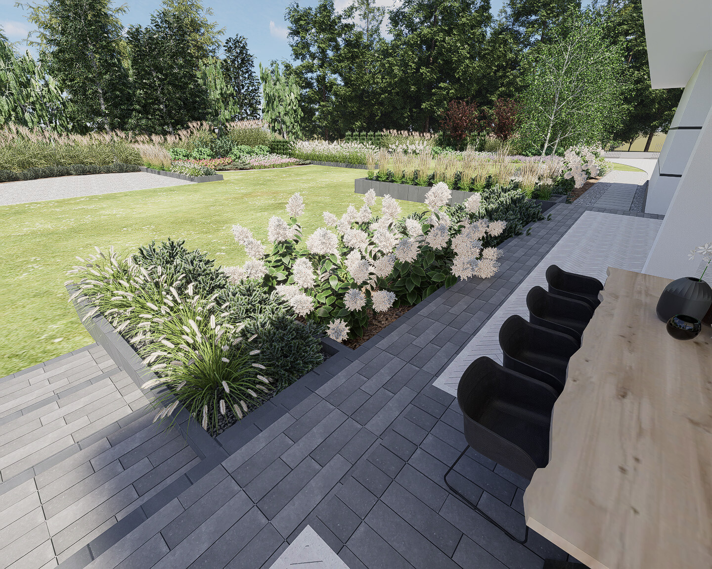 Część ogrodu była już zagospodarowana — istniał taras, podjazd i altana. Moim zadaniem było wkomponowanie tych elementów w całość i zaplanowanie zieleni tak, aby ogród zyskał strukturę, funkcję i przyjemny rytm.