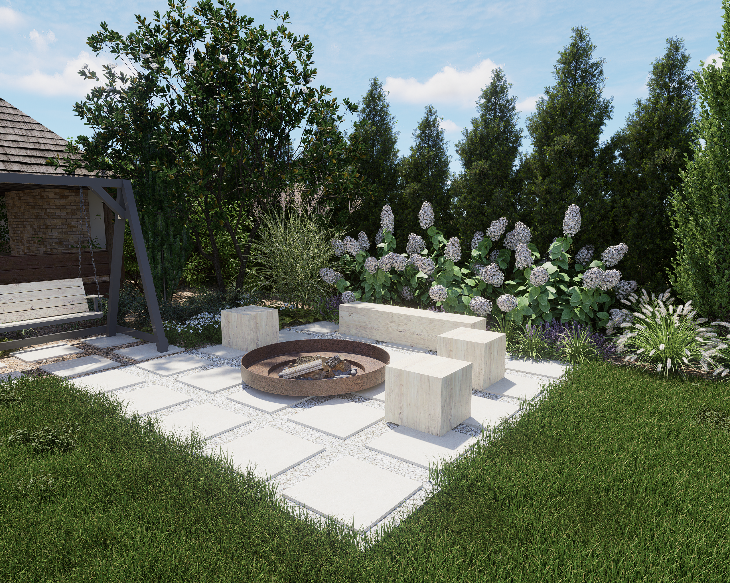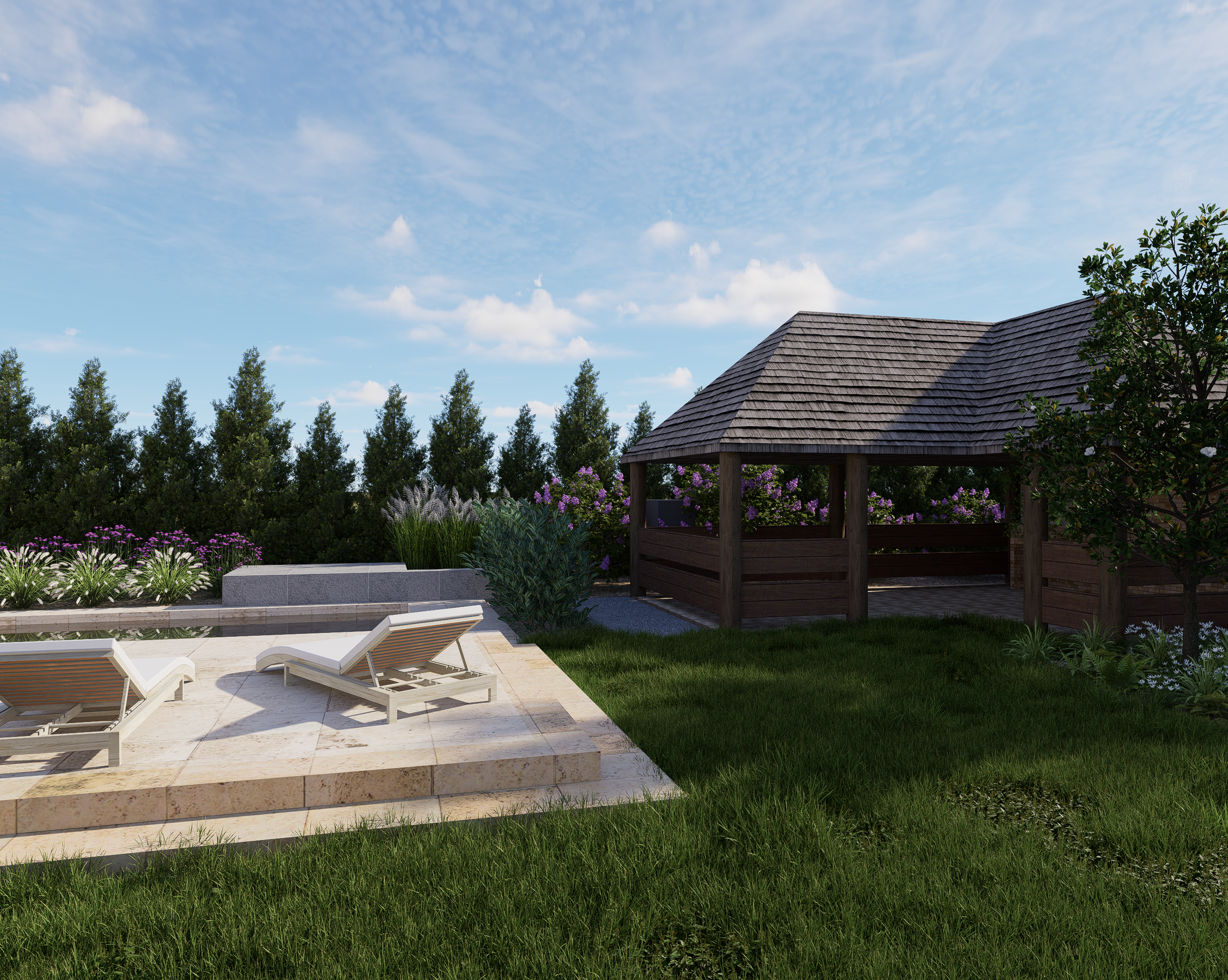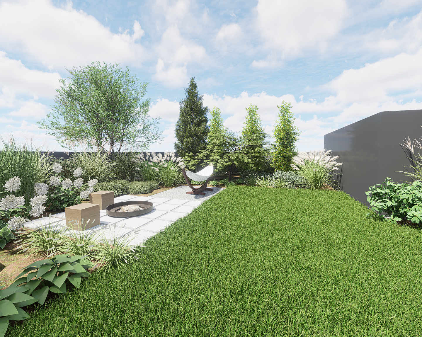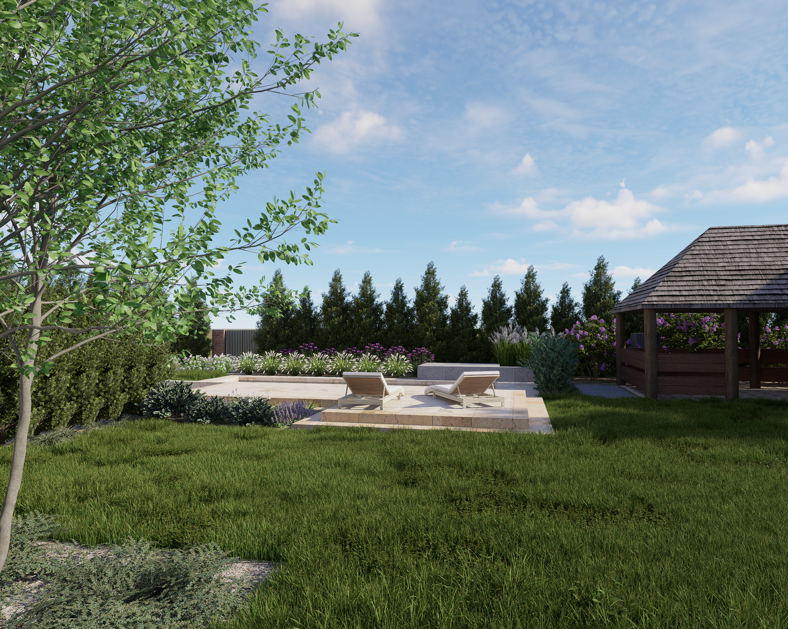 Część ogrodu była już zagospodarowana — istniał taras, podjazd i altana. Moim zadaniem było wkomponowanie tych elementów w całość i zaplanowanie zieleni tak, aby ogród zyskał strukturę, funkcję i przyjemny rytm.