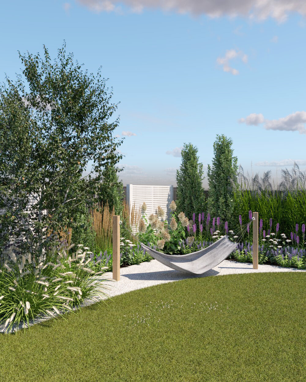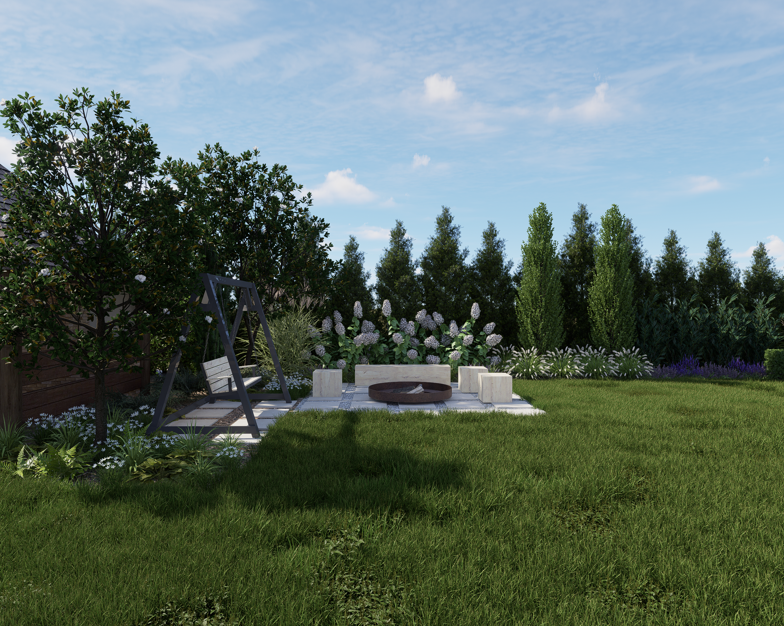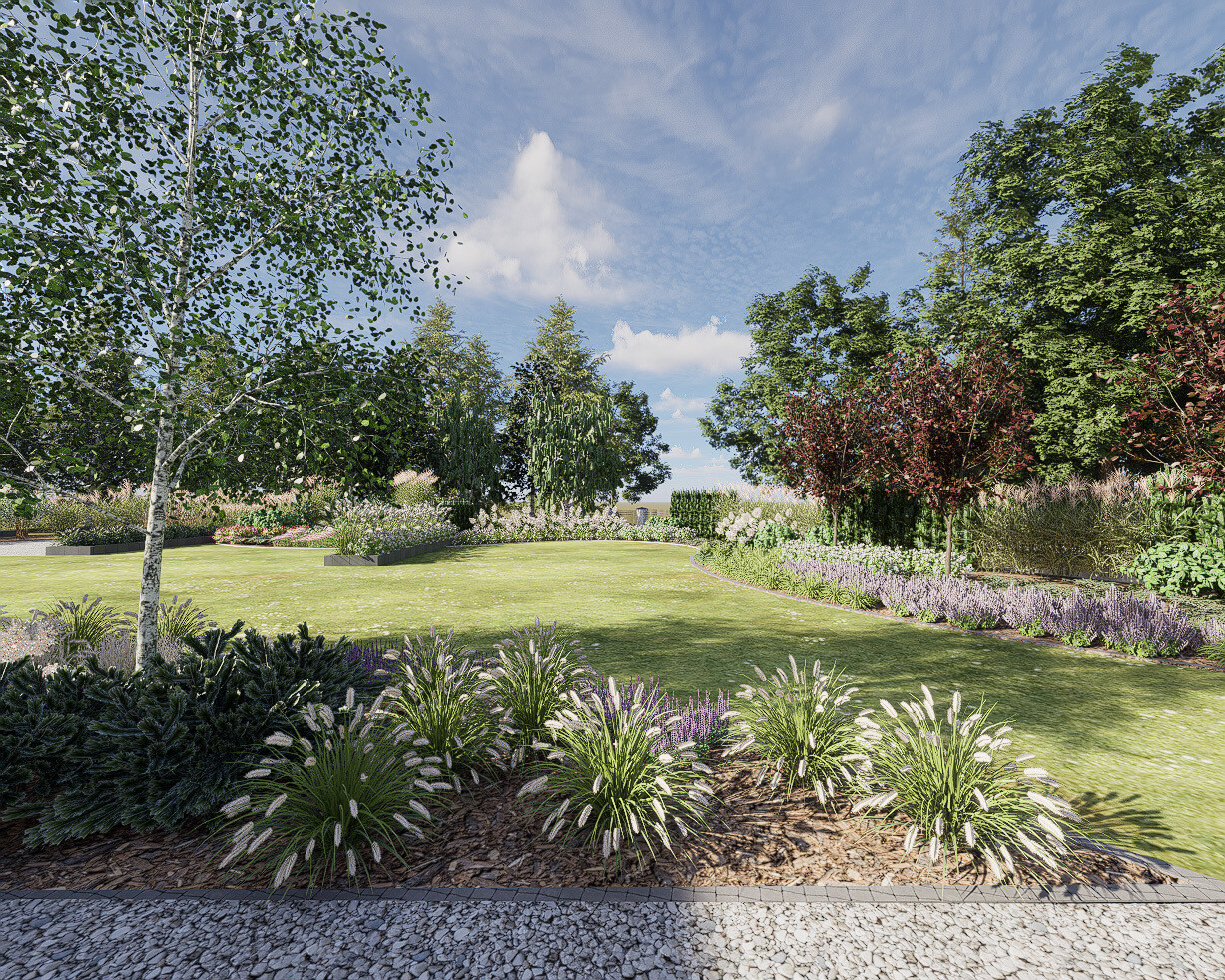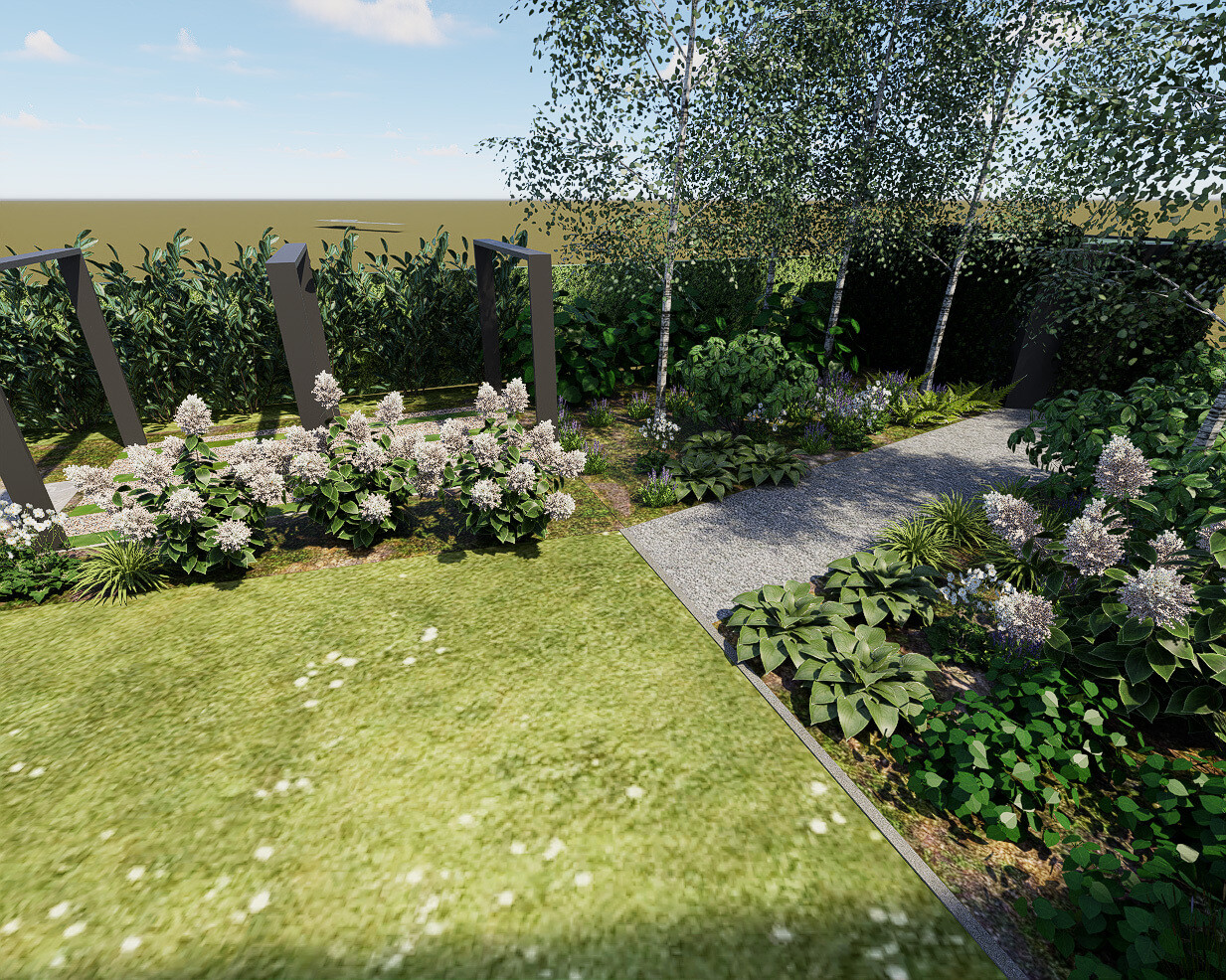 W projekcie uwzględniłam również fragmenty zacienione, dobierając gatunki dopasowane do warunków siedliskowych — estetyczne i trwałe, także w mniej nasłonecznionych częściach ogrodu.