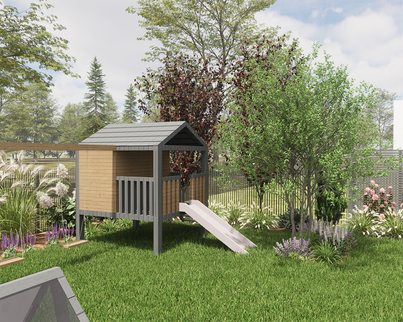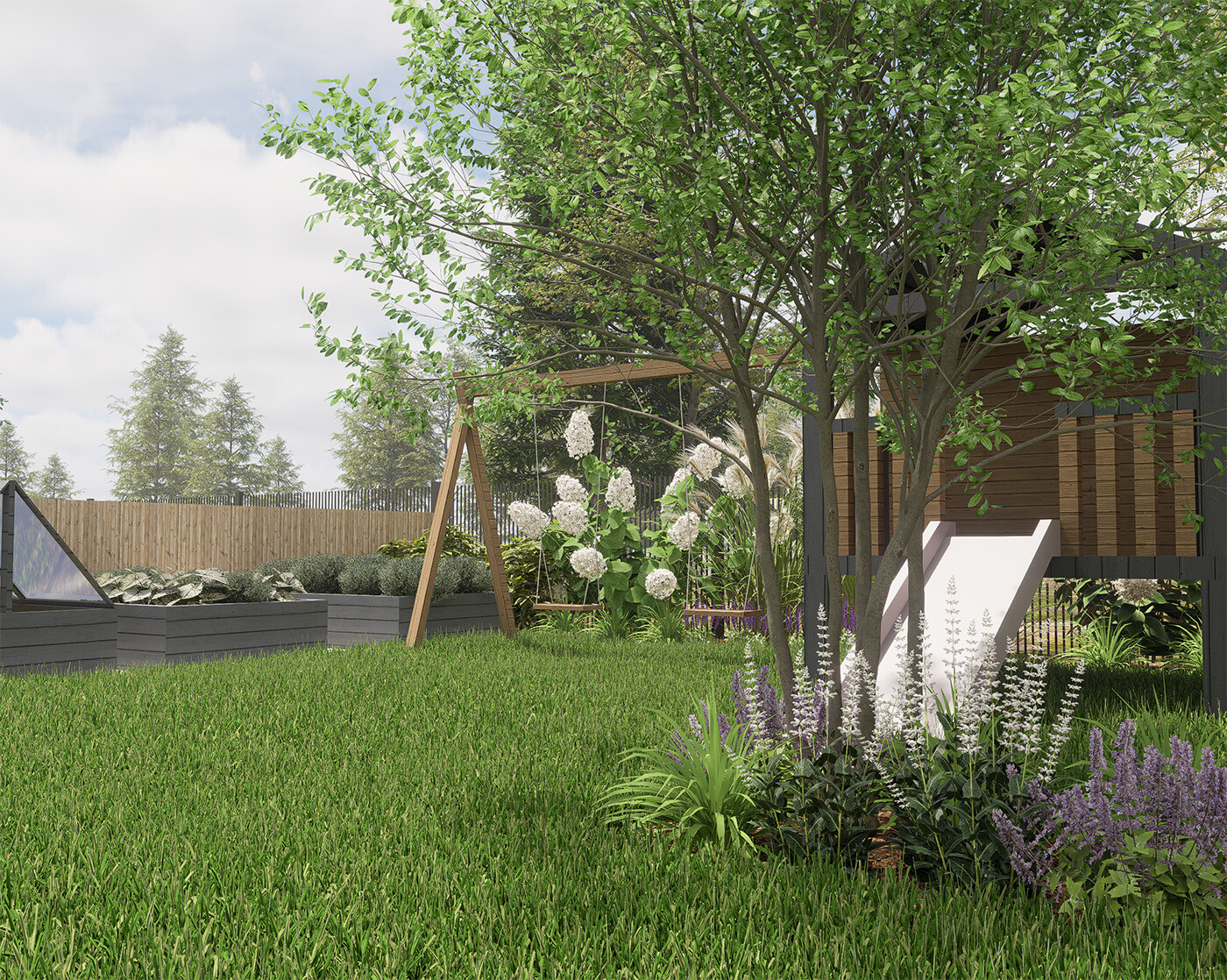 Na małej powierzchni udało się zmieścić wszystko, czego potrzebowali inwestorzy: miejsce do zabawy dla dzieci, ogródek warzywny, rabaty z roślinami ozdobnymi oraz domek narzędziowy. Dodatkowym założeniem projektowym było wydzielenie strefy wejściowej – oddzielonej ogrodzeniem i wyraźnie odseparowanej od części ogrodowej.