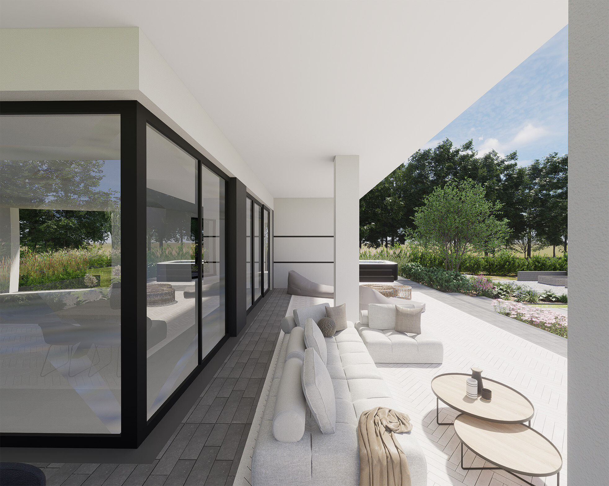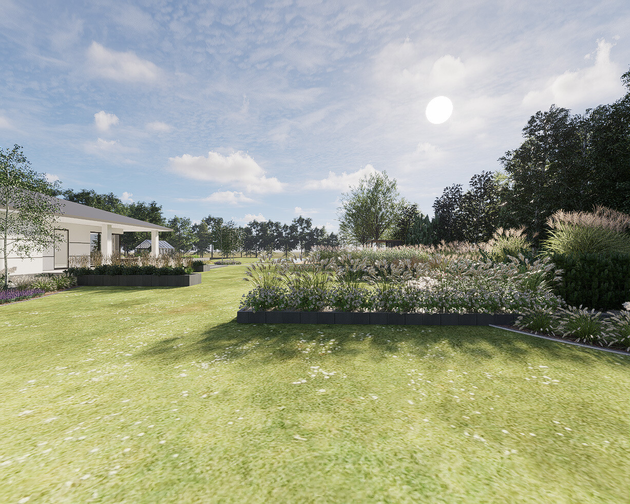 Ten projekt ogrodu powstał wokół basenu, który był już w trakcie budowy. Moim zadaniem było stworzenie spójnej, funkcjonalnej przestrzeni, która połączy nowoczesny charakter domu z naturalnymi, bardziej miękkimi nasadzeniami.