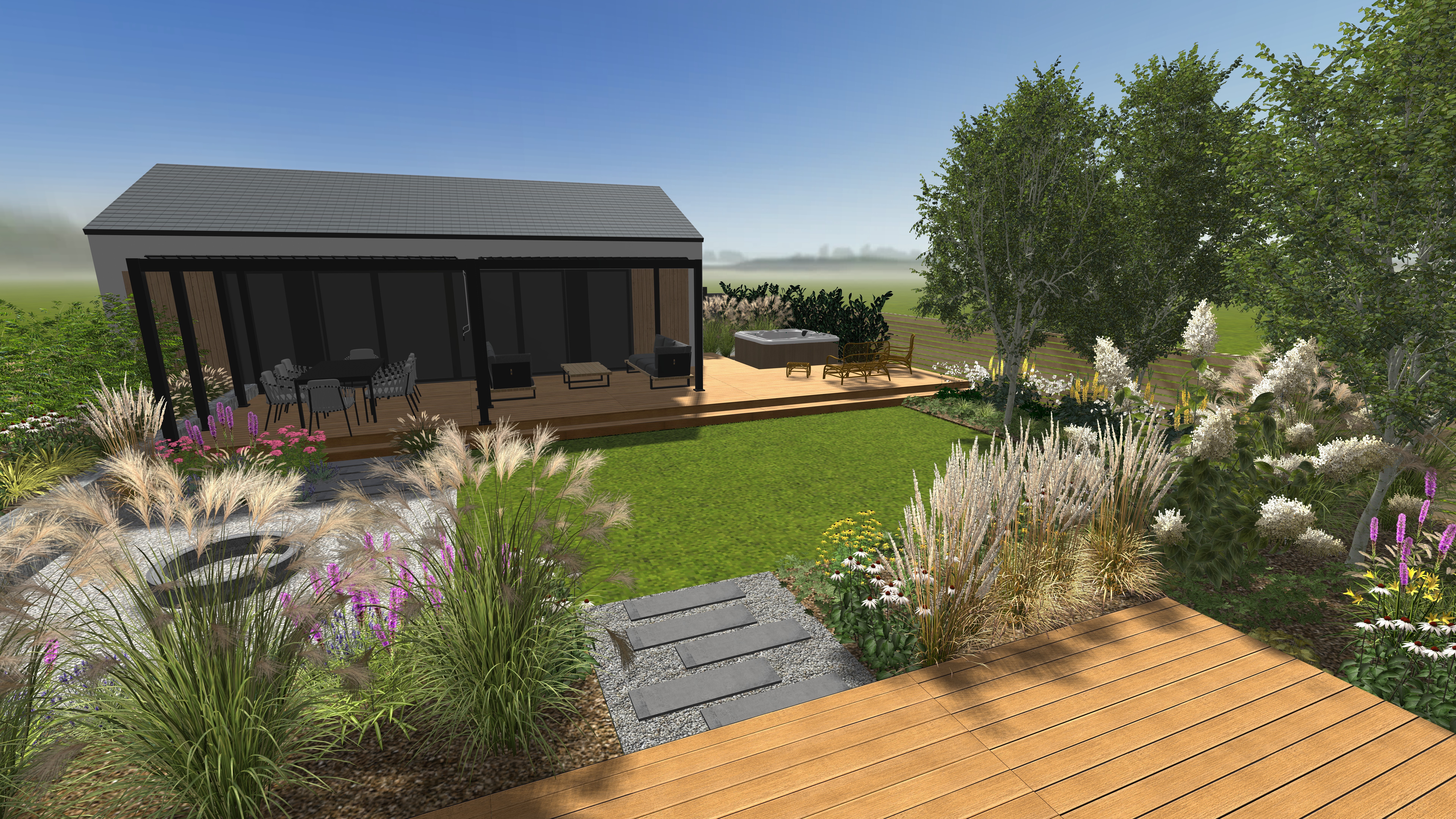 Część ogrodu była już zagospodarowana — istniał taras, podjazd i altana. Moim zadaniem było wkomponowanie tych elementów w całość i zaplanowanie zieleni tak, aby ogród zyskał strukturę, funkcję i przyjemny rytm.