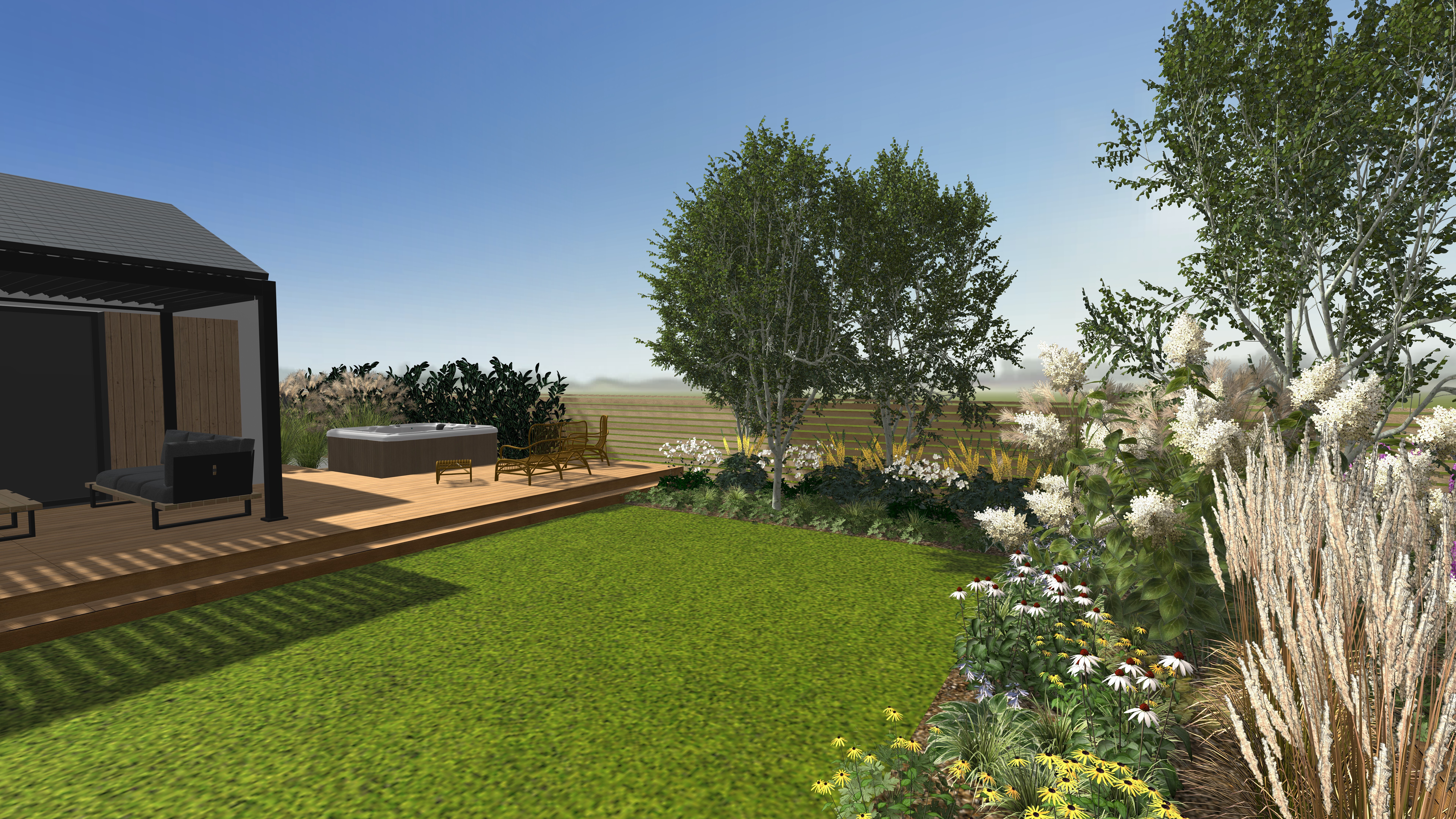W projekcie uwzględniłam również fragmenty zacienione, dobierając gatunki dopasowane do warunków siedliskowych — estetyczne i trwałe, także w mniej nasłonecznionych częściach ogrodu.