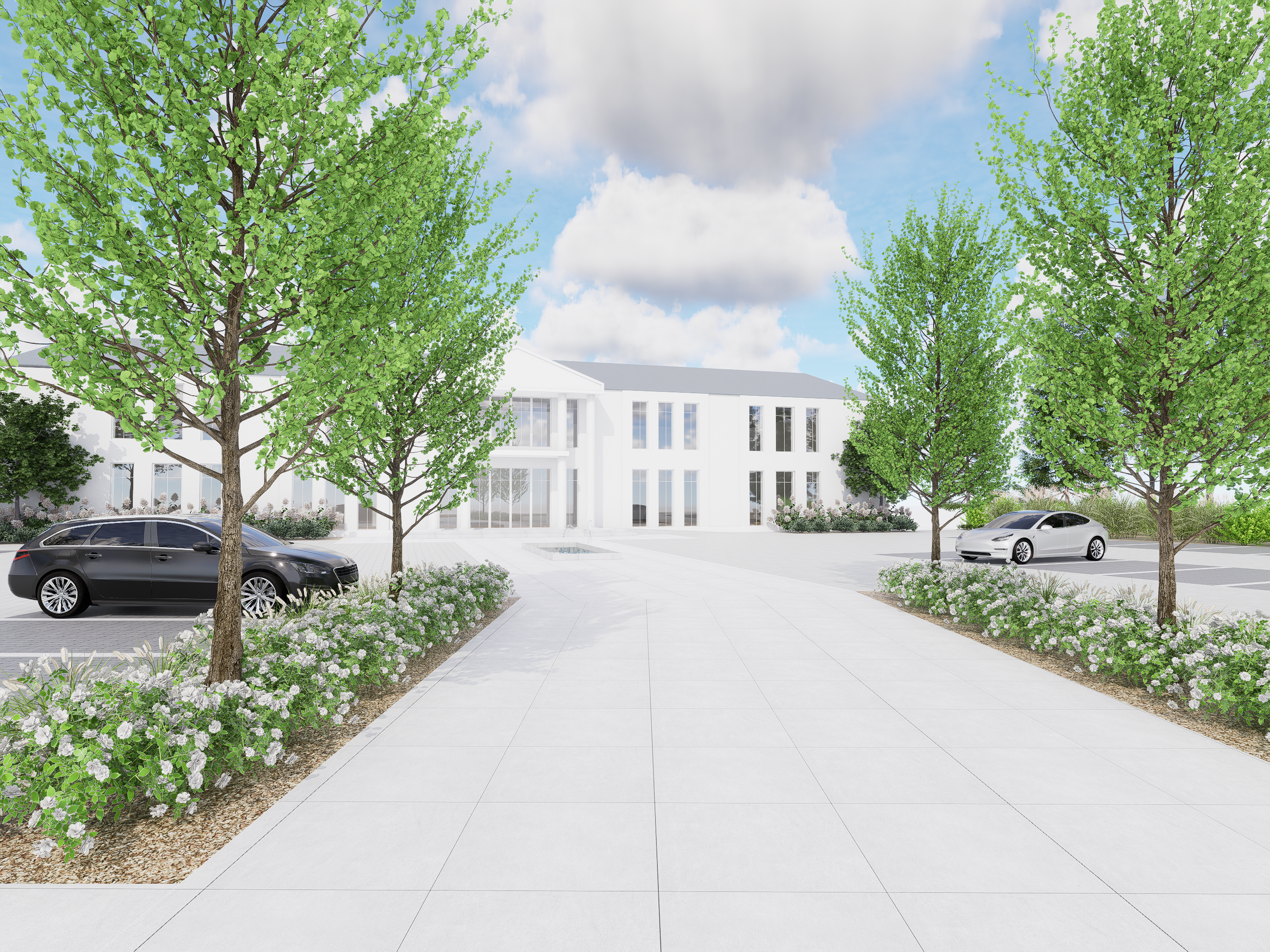 W części frontowej znalazł się parking dla gości oraz klasyczna fontanna, umieszczona centralnie na osi wejścia jako spokojny, ale wyrazisty akcent kompozycyjny.